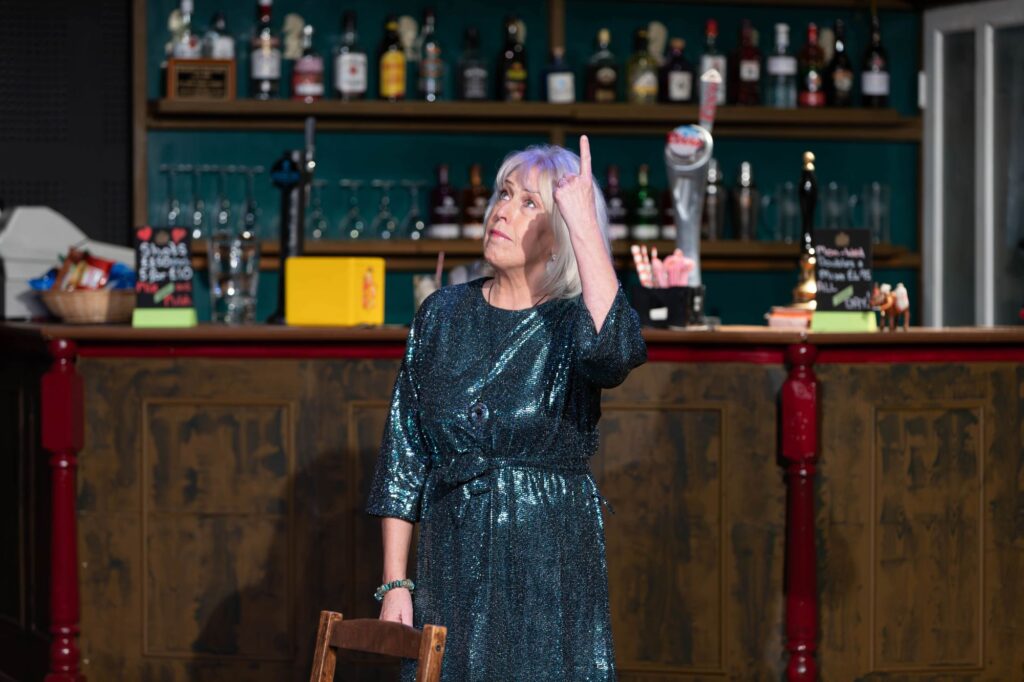 ‘In here’, in the cosy ‘local’ infused with the welcoming warmth of landlady Kathy, perfectly conveyed by People’s stalwart Maggie Childs in a sparkly dress, things are being kept as normal as possible.